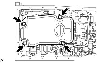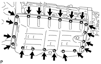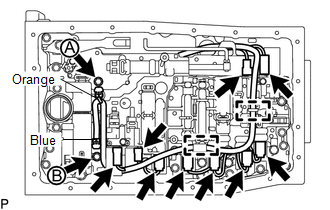 (c) Connect the 2 ATF temperature sensors with the 2 clamps and 2 bolts. Torque: for bolt A : 10 N·m {102 kgf·cm, 7 ft·lbf} for bolt B : 11 N·m {112 kgf·cm, 8 ft·lbf} HINT: Each bolt length is indicated below. 12 mm (0.472 in.) for bolt A 36 mm (1.41 in.) for bolt B (d) Attach the wire harness to the 2 clamps. 3. INSTALL VALVE BODY OIL STRAINER ASSEMBLY   (a) Coat a new O-ring with ATF, and install it to the oil strainer. (b) Install the oil strainer with the 4 bolts. Torque: 10 N·m {102 kgf·cm, 7 ft·lbf} 4. INSTALL AUTOMATIC TRANSMISSION OIL PAN SUB-ASSEMBLY   NOTICE: Be careful not to spill oil on the contacting surfaces of the transmission case and oil pan. (a) Install a new gasket and the oil pan with the 20 bolts. Torque: 7.0 N·m {71 kgf·cm, 62 in·lbf} 5. ADD AUTOMATIC TRANSMISSION FLUID (a) Add automatic transmission fluid (See page