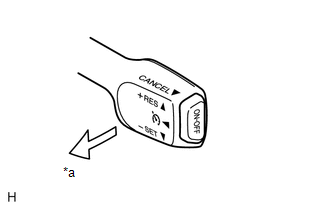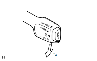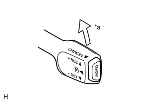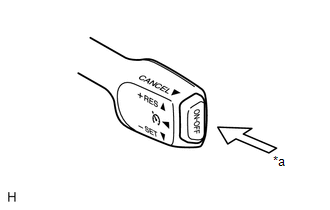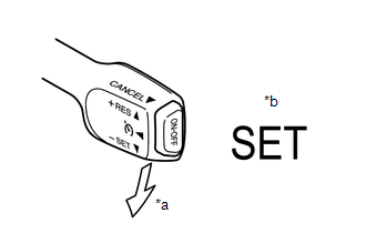 (5) Push the cruise control main switch to -SET, and then release it immediately. Check that vehicle speed decreases by approximately 1 km/h or 1 mph (tap-down control). (d) Inspect the CANCEL function. (1) Turn the cruise control system on using the cruise control main switch (ON-OFF button).
