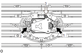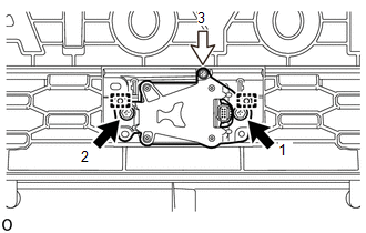 (1) Attach the 2 guides. (2) Temporarily install the millimeter wave radar sensor assembly with the 2 bolts and screw. (3) Tighten the 2 bolts and screw in the order shown in the illustration. Torque: Bolt : 2.5 N·m {25 kgf·cm, 22 in·lbf} (b) for Type B: