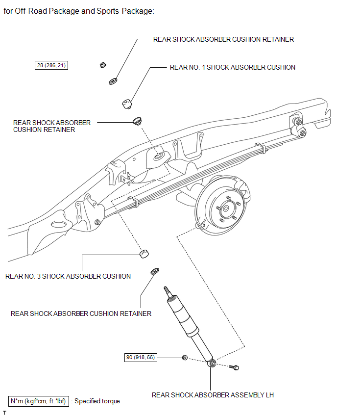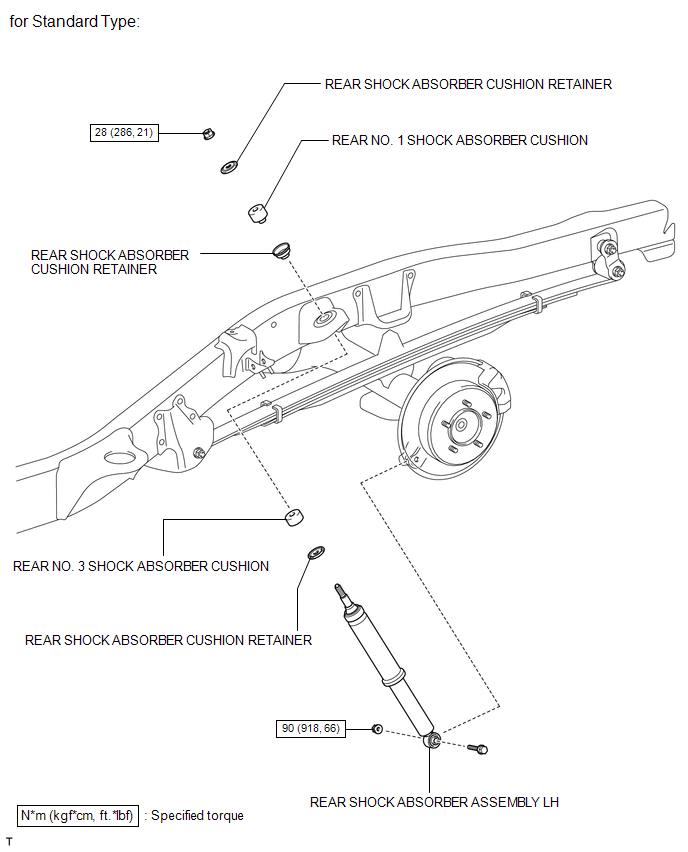 2. STABILIZE SUSPENSION (a) Lower the vehicle. (b) Press down on the vehicle several times to stabilize the suspension. 3. TIGHTEN REAR SHOCK ABSORBER ASSEMBLY LH (a) Tighten the bolt and 2 nuts. Torque: Upper side : 28 N·m {286 kgf·cm, 21 ft·lbf} Lower side : 90 N·m {918 kgf·cm, 66 ft·lbf} 4. INSTALL REAR WHEEL Torque: for Aluminum Wheel : 131 N·m {1336 kgf·cm, 97 ft·lbf} for Steel Wheel : 209 N·m {2131 kgf·cm, 154 ft·lbf} 5. REMOVE SAFETY STANDS Removal REMOVAL CAUTION / NOTICE / HINT HINT: