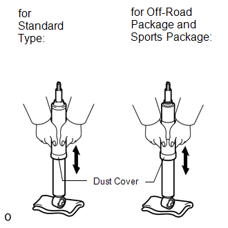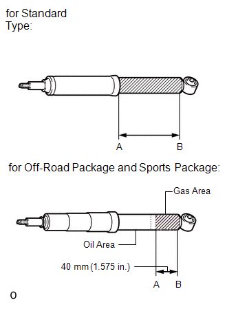 Components COMPONENTS ILLUSTRATION ILLUSTRATION Disposal DISPOSAL PROCEDURE 1. DISPOSE OF SHOCK ABSORBER ASSEMBLY REAR (a) Fully extend the rear shock absorber rod. (b) Using a drill, make a hole in the cylinder between A and B shown in the illustration to discharge the gas inside. CAUTION: Be careful when drilling because shards of metal may fly about. Always use the proper safety equipment. NOTICE: The gas is colorless, odorless and nonpoisonous. Inspection INSPECTION PROCEDURE 1. INSPECT REAR SHOCK ABSORBER ASSEMBLY LH (a) Compress and extend the shock absorber rod 4 times or more. Check that there is no abnormal resistance or unusual sound during the operation. If there is any abnormality, replace the shock absorber assembly with a new one. NOTICE: