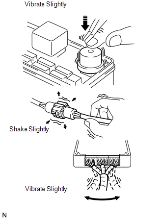 If a DTC was displayed in the initial DTC check, the problem may have occurred in a wire harness or connector in that circuit in the past. Check the wire harness and connectors. The problem is still occurring in a place other than the diagnostic circuit (the DTC displayed first is either for a past problem or a secondary problem). 19. SYMPTOM SIMULATION HINT: The most difficult case in troubleshooting is when no problem symptoms occur. In such a case, a thorough problem analysis must be carried out. A simulation of the same or similar conditions and environment in which the problem occurred in the customer's vehicle should be carried out. No matter how much skill or experience a technician has, troubleshooting without confirming the problem symptoms will lead to important repairs being overlooked and mistakes or delays. For example: With a problem that only occurs when the engine is cold or as a result of vibration caused by the road during driving, the problem can never be determined if the symptoms are being checked on a stationary vehicle or on a vehicle with a warmed-up engine. Vibration, heat or water penetration (moisture) is difficult to reproduce. The symptom simulation tests below are effective substitutes for the conditions and can be applied on a stationary vehicle. Important points in the symptom simulation test: In the symptom simulation test, the problem symptoms as well as the problem area or parts must be confirmed. First, narrow down the possible problem circuits according to the symptoms. Then, connect the tester and carry out the symptom simulation test, judging whether the circuit being tested is defective or normal. Also, confirm the problem symptoms at the same time. Refer to the problem symptoms table for each system to narrow down the possible causes. To reproduce DTCs, it is necessary to satisfy the respective DTC detection conditions. (a) VIBRATION METHOD: When a malfunction seems to occur as a result of vibration. (1) PART AND SENSOR Apply slight vibration with a finger to the part of the sensor suspected to be the cause of the problem, and check whether or not the malfunction occurs. NOTICE: Applying strong vibration to relays may open them. (2) CONNECTORS Slightly shake the connector vertically and horizontally. (3) WIRE HARNESS Slightly shake the wire harness vertically and horizontally. HINT: The connector joint and fulcrum of the vibration are the major areas that should be checked thoroughly. (b) HEAT METHOD: When a malfunction seems to occur when the area in question is heated. (1) Heat the component that is the possible cause of the malfunction with a hair dryer or similar device. Check if the malfunction occurs. NOTICE: