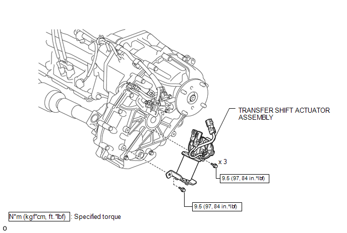 (b) Install the transfer shift actuator assembly with the 4 bolts. Torque: 9.5 N·m {97 kgf·cm, 84 in·lbf} NOTICE: Tighten the bolts of the transfer shift actuator assembly within 10 minutes of applying the seal packing. The seal packing will dry very quickly. (c) Connect the 3 connectors and attach the 2 clamps. Removal REMOVAL CAUTION / NOTICE / HINT NOTICE: Change the vehicle to 2WD mode before removing the transfer shift actuator assembly. If the vehicle cannot be changed to 2WD mode, since the new transfer shift actuator assembly is set in the 2WD position, connect all the connectors to the vehicle side wire harnesses to set the new transfer shift actuator assembly to the drive state of the vehicle before installing the new transfer shift actuator assembly. PROCEDURE 1. REMOVE TRANSFER SHIFT ACTUATOR ASSEMBLY