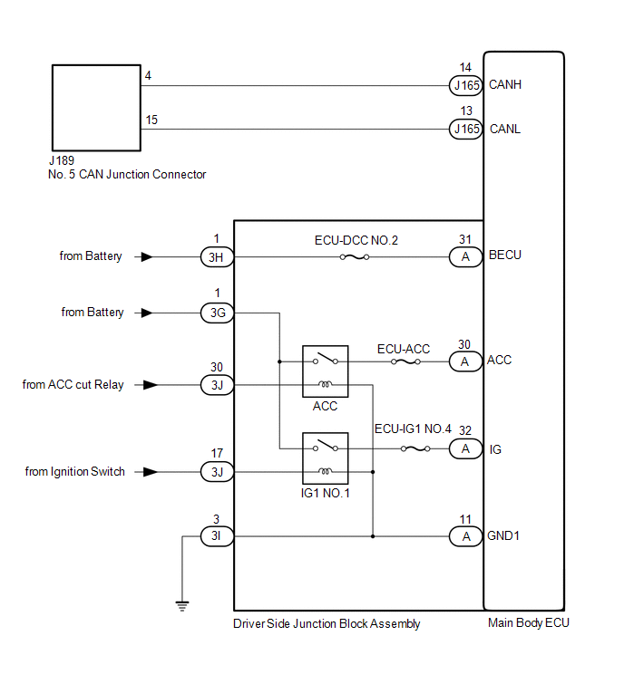 - Power source circuit of main body ECU (multiplex network body ECU) or driver side junction block assembly