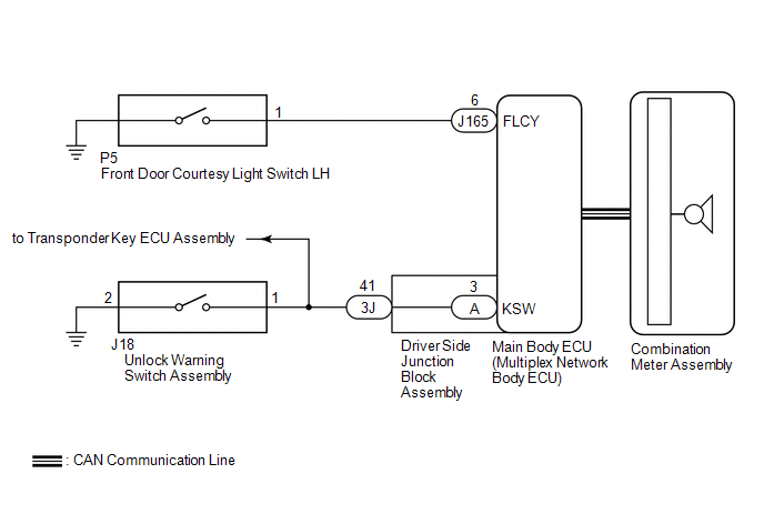 | DESCRIPTION The key reminder warning buzzer sounds when the driver side door is opened while the ignition switch is in the LOCK or ACC position. The key reminder warning buzzer is activated when the main body ECU (multiplex network body ECU) sends a key switch signal and front door courtesy light switch LH signal to the combination meter assembly. WIRING DIAGRAM   CAUTION / NOTICE / HINT NOTICE: The key reminder warning system uses the CAN communication system. Inspect the communication function by following How to Proceed with Troubleshooting. Troubleshoot the key reminder warning system after confirming that the communication systems are functioning properly. Click here  PROCEDURE