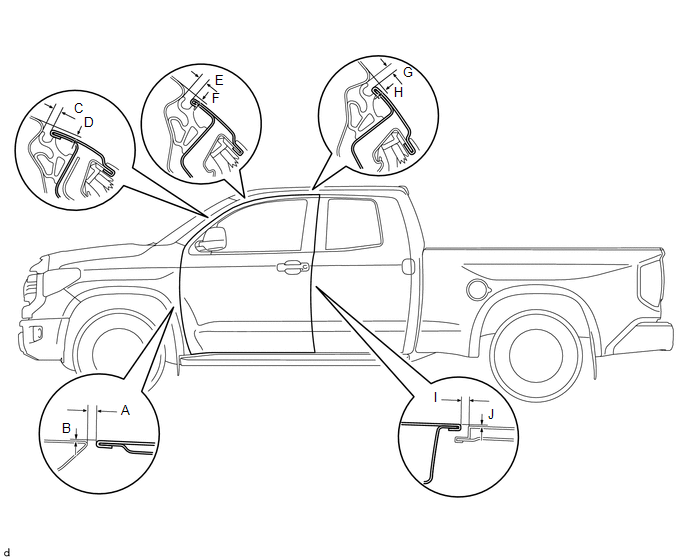 ON-VEHICLE INSPECTION PROCEDURE 1. INSPECT FRONT DOOR PANEL SUB-ASSEMBLY LH (a) Check that the clearance measurements of areas A to J are within the standard range.