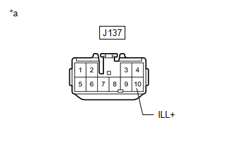 | (a) Disconnect the radio and display receiver assembly connector. |   |   |   |   | *a | Front view of wire harness connector (to Radio and Display Receiver Assembly) |  |  |  (b) Measure the voltage according to the value(s) in the table below. Standard Voltage:    | Tester Connection | Switch Condition | Specified Condition |   | J137-10 (ILL+) - Body ground | Light control switch in tail or head position | 11 to 14 V |    | NG |   | REPAIR OR REPLACE HARNESS OR CONNECTOR |    |