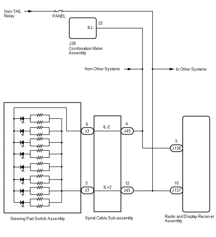 | OK |   |   |  |    | 8.  | CHECK HARNESS AND CONNECTOR (RADIO AND DISPLAY RECEIVER ASSEMBLY - COMBINATION METER ASSEMBLY) |  (a) Disconnect the J138 radio and display receiver assembly connector. (b) Disconnect the J28 combination meter assembly connector. (c) Measure the resistance according to the value(s) in the table below. Standard Resistance:    | Tester Connection | Condition | Specified Condition |   | J138-5 (ILL-) - J28-22 (ILL-) | Always | Below 1 Ω |    | OK |   | REPLACE RADIO AND DISPLAY RECEIVER ASSEMBLY |    | NG |   | REPAIR OR REPLACE HARNESS OR CONNECTOR |  |
