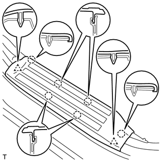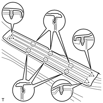 (a) Detach the 6 claws and 3 clips, and remove the front door scuff plate LH. 8. REMOVE FRONT DOOR SCUFF PLATE RH HINT: Use the same procedure described for the LH side. 9. REMOVE REAR DOOR SCUFF PLATE LH