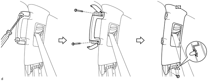 20. REMOVE LOWER CENTER PILLAR GARNISH RH HINT: Use the same procedure described for the LH side. 21. REMOVE CENTER PILLAR GARNISH LH (a) Using a screwdriver, detach the 2 claws and open the 2 assist grip covers. HINT: Tape the screwdriver tip before use. (b) Remove the 2 bolts and rear assist grip assembly from the center pillar garnish LH. (c) Remove the bolt. (d) Detach the clip, guide and remove the center pillar garnish LH.