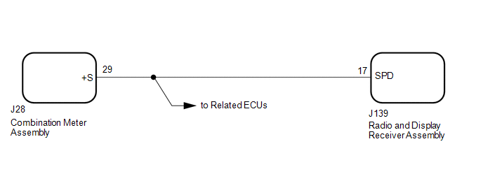 | NG |   |   |  |    | 2.  | CHECK HARNESS AND CONNECTOR (RADIO AND DISPLAY RECEIVER ASSEMBLY - COMBINATION METER ASSEMBLY) |  (a) Disconnect the J139 radio and display receiver assembly connector. (b) Disconnect the J28 combination meter assembly connector. (c) Measure the resistance according to the value(s) in the table below. Standard Resistance:    | Tester Connection | Condition | Specified Condition |   | J139-17 (SPD) - J28-29 (+S) | Always | Below 1 Ω |   | J139-17 (SPD) - Body ground | Always | 10 kΩ or higher |    | NG |   | REPAIR OR REPLACE HARNESS OR CONNECTOR |    |