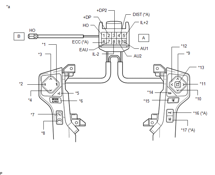 If the result is not as specified, replace the steering pad switch assembly. (b) Check the illumination. (1) Connect the battery positive (+) lead to terminal A5 (IL+2) and the negative (-) lead to terminal A8 (IL-2) of the steering pad switch assembly connector. (2) Check that the switch illumination comes on. OK: Steering pad switch illumination comes on. If the result is not as specified, replace the steering pad switch assembly. | ||||||||||||||||||||||||||||||||||||||||||||||||||||||||||||||||||||||||||||||||||||||||||||||||||||||