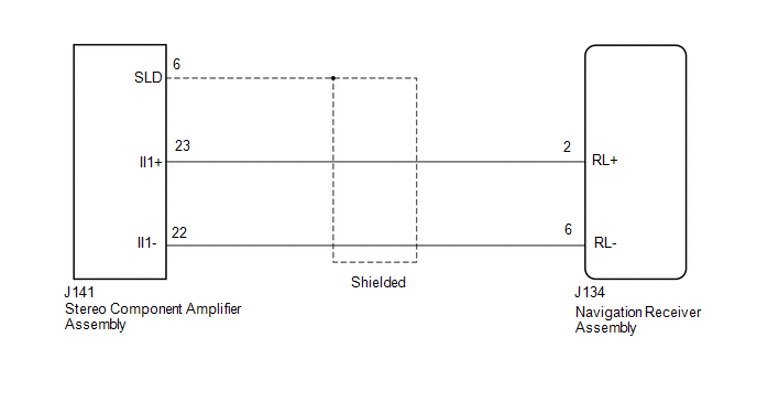 (a) Disconnect the J134 navigation receiver assembly connector. (b) Disconnect the J141 stereo component amplifier connector. (c) Measure the resistance according to the value(s) in the table below. Standard Resistance: