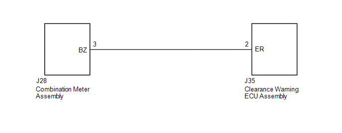 (a) Disconnect the J35 clearance warning ECU assembly connector. (b) Disconnect the J28 combination meter assembly connector. (c) Measure the resistance according to the value(s) in the table below. Standard Resistance: