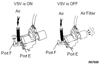 (a) Disconnect the vacuum hose from port F on the vacuum switching valve (for ACIS). (b) Connect the Techstream to the DLC3. (c) Start the engine. (d) Enter the following menus: Powertrain / Engine and ECT / Active Test / Active the VSV for Intake Control. (e) Operate the VSV for ACIS. (f) Check the VSV air flow when switching the VSV. OK: