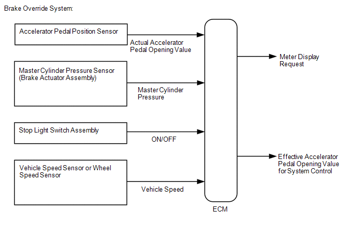 NOTICE: The vehicle may not enter the brake override system control due to the relation of the accelerator pedal angle and the vehicle's speed. Items Controlled: