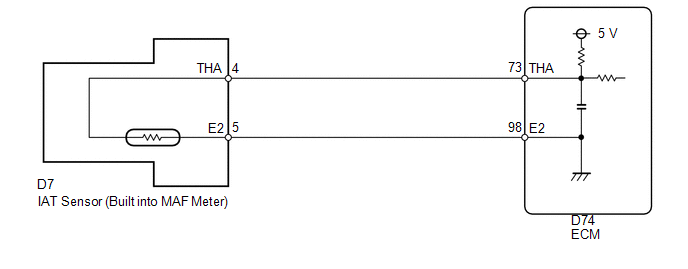 - The IAT sensor is powered by a 5 V supply from the THA terminal of the ECM, via resistor R.