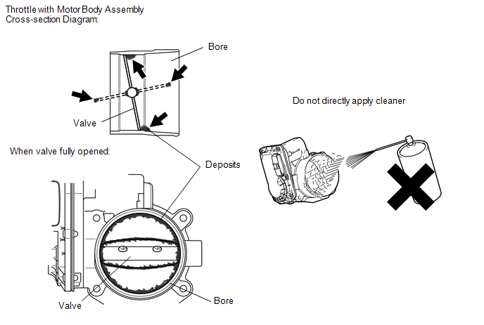 (a) Clean off any deposits from the inside of the throttle with motor body assembly. (1) Push open the throttle valve and wipe off any carbon from the valve and bore using a cloth soaked in non-residue solvent. NOTICE: