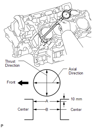 2. INSPECT CYLINDER BORE (a) Using a cylinder gauge, measure the cylinder bore diameter at positions A and B in the thrust and axial directions.